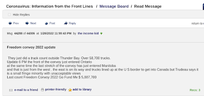 Just heard an interview on BBC with a trucker waiting outside Toronto to join the convoy. Over the course of just three minutes, he told the world: - that this was the biggest protest in Canadian history (incorrect) - that this had been declared the longest convoy in history (the only source I can find for that assertion is an article by Joe Warmington, whose assertion began "Some people say that this MAY be...") - that 80% of Canadians support the truckers - that "literally every overpass from BC to Ottawa have been jammed with hundreds of cheering supporters"